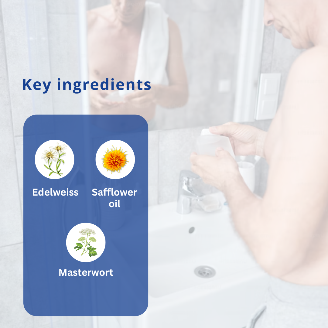 Extracts of masterwort, edelweiss, alpine skullcap and ginkgo, safflower oil, coconut oil, allantoin, glycerin, and vitamin E.