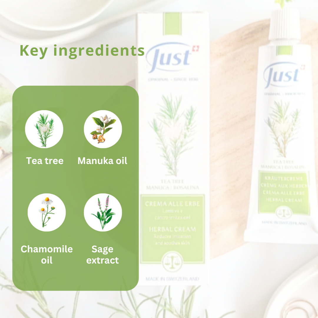 A cream with a wide field of application for all skin types and skin impurities. Tea Tree cream has a regenerating and calming effect and it leaves your skin feeling pleasantly soft and silky. The cream can be used for skin problems like acne and warts but also for open wounds, scars and burns. In combination with the use of Just Tea Tree oil, the results are accelerated. Rosalina, an active ingredient, has a broad antibacterial spectrum and a calming effect on the skin while acting deeper and strengthening the immune system. So the beauty of this cream is really, more than just skin deep. Dermatologically tested.