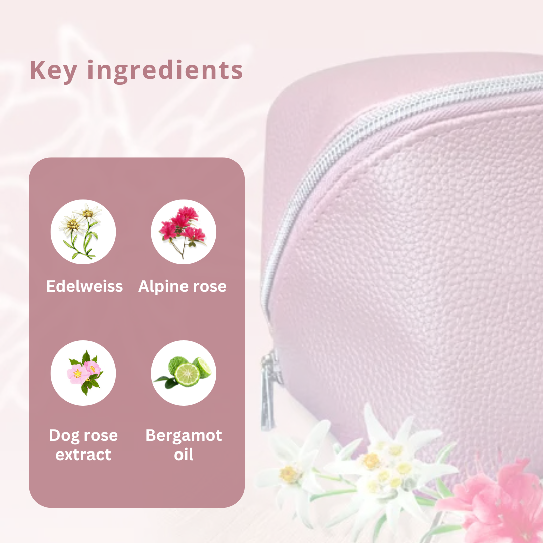 Edelweiss extract, Alpine rose flower water, Dog rose extract, Provence rose flower extract, Texas cedar and bergamot essential oil, Glycerin, Panthenol